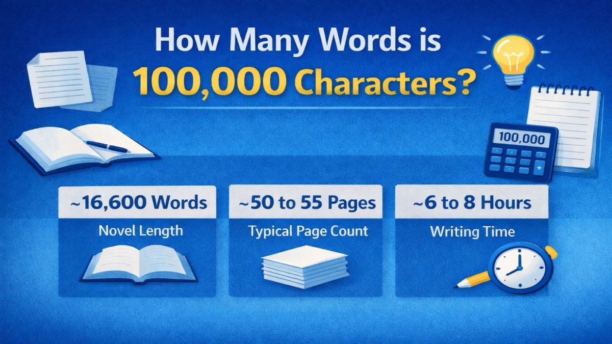 Short answer: 100,000 characters equals approximately 17,500 to 21,000 words — roughly 17,500 words when spaces are included (the default on every major writing platform) and around 21,000 words when spaces are stripped out. At that length, you are looking at a full short novella, a master's thesis, or a comprehensive long-form research report. This is serious, book-length territory — not a quick blog post.