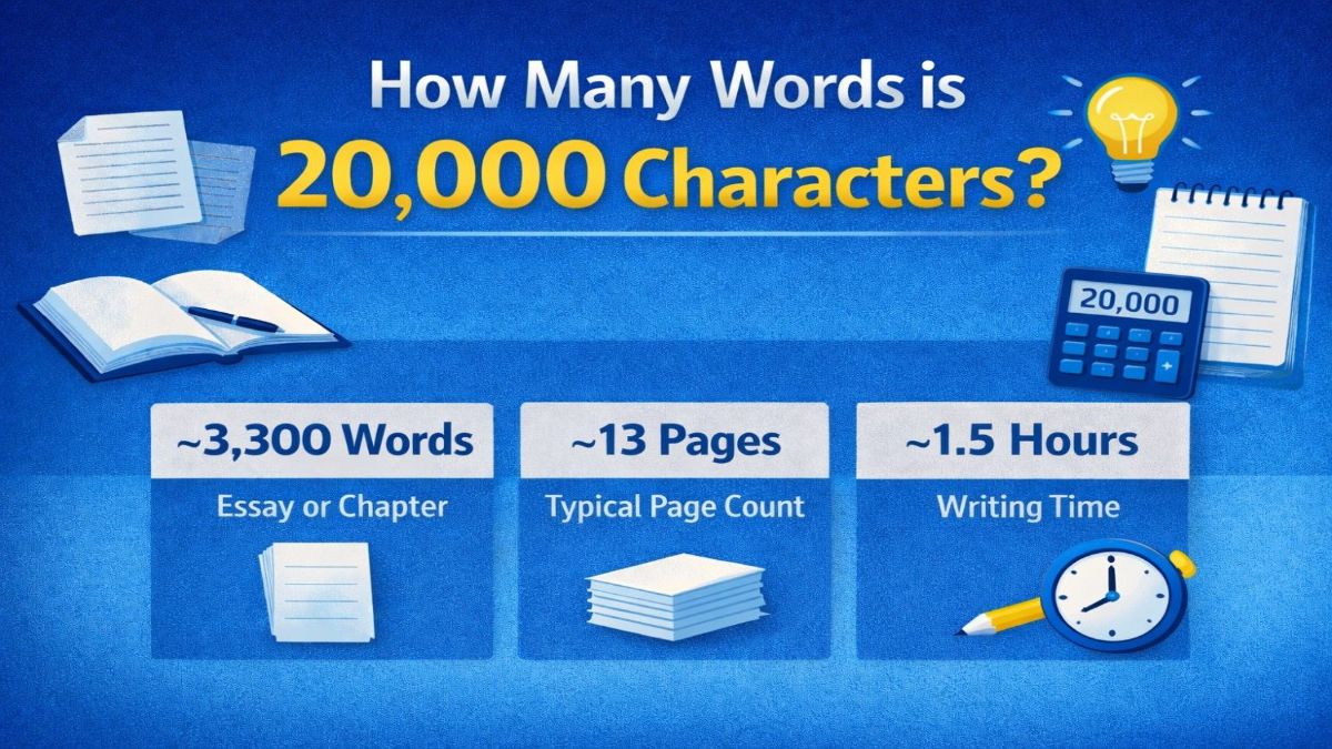 Short answer: 20,000 characters equals approximately 3,508 words when spaces are included — the default counting method on virtually every writing platform and word processor today. Strip the spaces out, and those same 20,000 characters expand to roughly 4,255 words. Either way, you are working with a substantial content block: enough for a thorough long-form blog post, a detailed white paper section, a comprehensive undergraduate essay, or a full chapter in a business e-book.