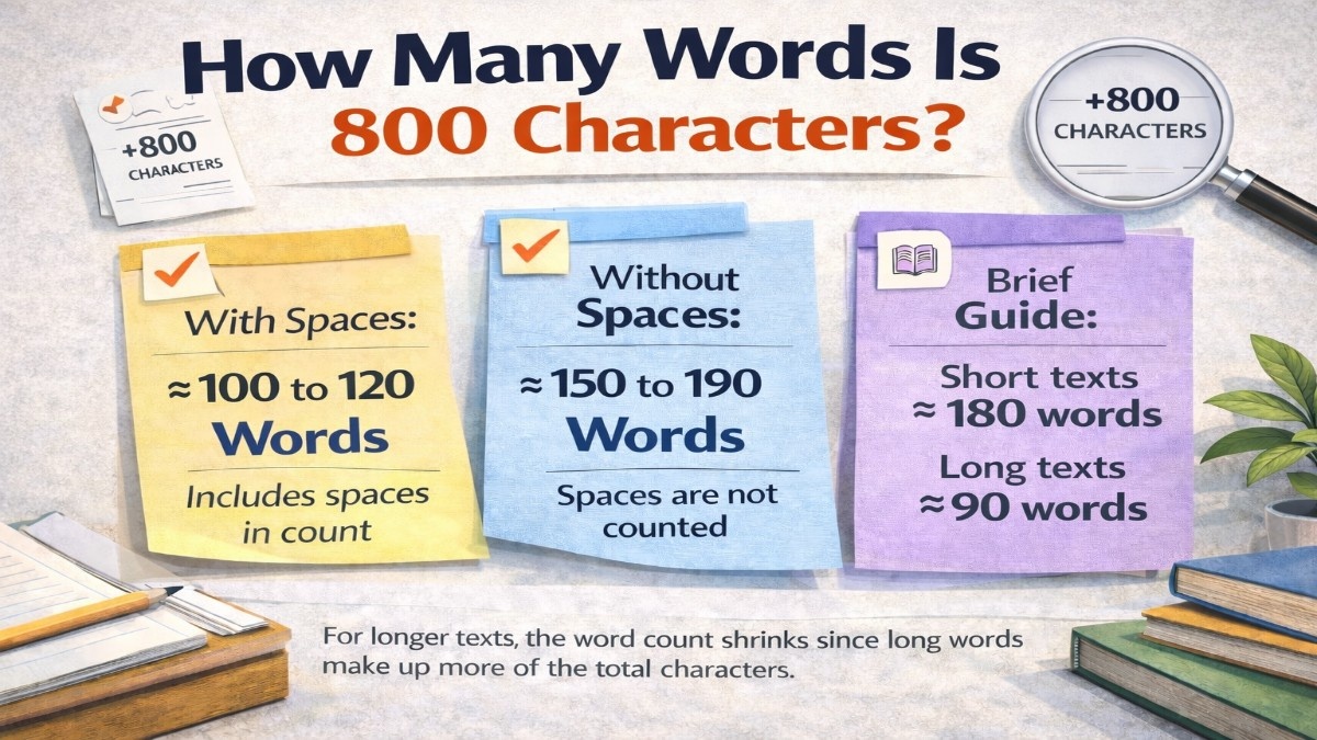 The direct, verified answer: 800 characters equals approximately 130 to 145 words when spaces are counted, or roughly 165 to 170 words if spaces are excluded. The estimate is grounded in the Oxford English Dictionary corpus average of 4.7 characters per English word — rising to 5.7 characters when the trailing space is included.