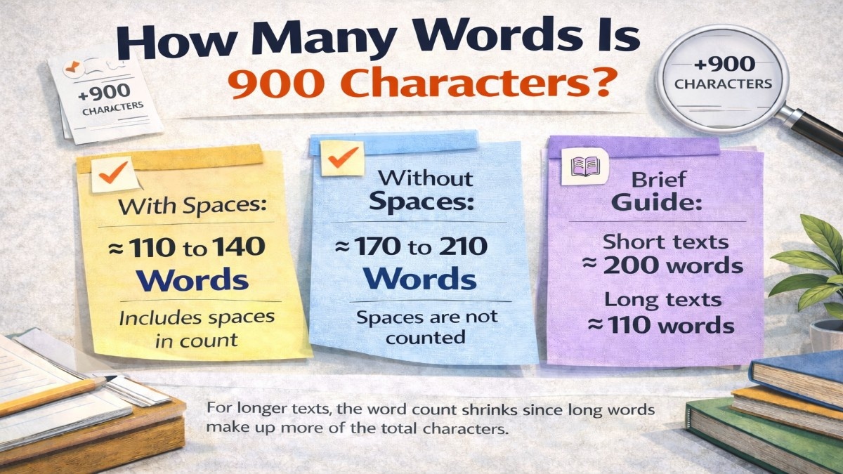 Short answer: 900 characters equals approximately 130 to 160 words when spaces are counted — the default on virtually every writing platform and word-processing tool available today. Strip the spaces out and those same 900 characters stretch to roughly 185 to 195 words. Either way, you are working with a tight, focused content block: enough for a confident social media caption, a sharp email opener, or one well-developed paragraph inside a longer piece.